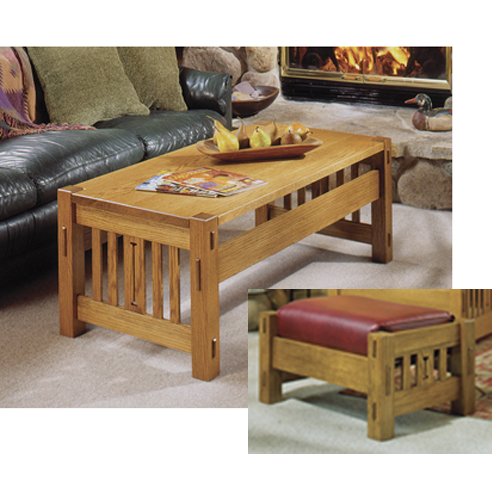 In separate downloadable plans, we introduced this impressive Arts-and-Crafts Collection with the Morris-style chair and bookcase. Here, we follow suit with this handsome coffe table & ottoman.