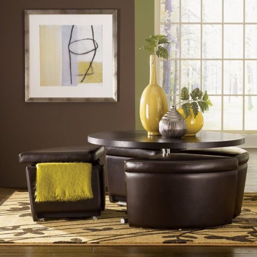 Fabric :Peebles Brown Vinyl, Finish :Java The Sedona occasional group offers coffee table and dining table all in one. The table is on a gas piston allowing for the raising and lowering of the top. This means it can be used as a coffee table and then raised to dining heights. The storage ottomans are in a faux leather and are castered for easy movement. Pneumatic chrome base allows top to adjust from cocktail to dining height 4 ottomans w/ storage and casters included Vinyl upholstery CA fire rated safety foam Fully assembled